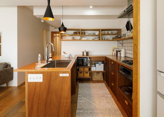 出典:ゼロリノベ ※コの字型で作業スペースと収納をたっぷり確保した造作キッチン