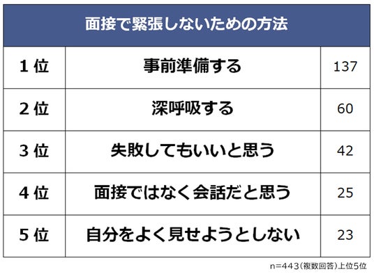 そこで今回、株式会社R&G( https://r-andg.jp/ )は、就職・転職活動で面接を受けたことがある443人に「面接で緊張しない方法」についてアンケート調査を実施。その結果をランキング形式でまとめました。