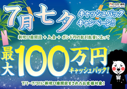 ヒロセ通商株式会社 (本社:大阪府西区、代表取締役:野市 裕作、以下:当社)は、当社の提供する「LION FX」において、2025年7月1日(火)より、「7月七夕最大100万円キャッシュバックキャンペーン!」を実施いたしましたのでお知らせいたします。