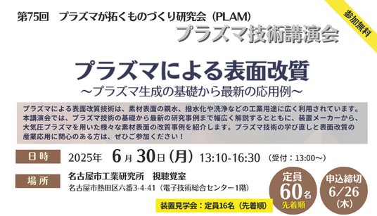 プラズマによる表面改質技術は、素材表面の親水、撥水化や洗浄などの工業用途に広く利用されています。本講演会では、プラズマ技術の基礎から最新の研究事例まで幅広く解説するとともに、装置メーカーから、大気圧プラズマを用いた様々な素材表面の改質事例を紹介します。プラズマ技術の学び直しと表面改質の産業応用に関心のある方はぜひご参加ください!
