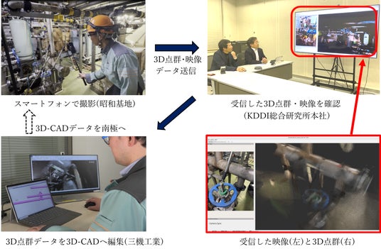 昭和基地で3D点群圧縮伝送ソフトウエアをインストールしたLiDAR搭載のスマートフォンを用いて設備を計測・撮影、計測・撮影したデータを圧縮しStarlink回線を通じて伝送。KDDI総合研究所本社に設置したシステムで受信・伸長しモニター表示。