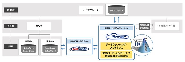 そこで、ランドスケイプは、パソナグループに顧客データ総合ソリューション「ユーソナー」を導入し、グループ各社が保有しているデータを横串に刺して分析・活用が出来るデータ基盤を構築しました。同時に、パソナグループの子会社にあたる株式会社パソナにおいても、事業部ごとに導入しているセールスフォース・ジャパン社の「Salesforce Sales Cloud」(SFA)とユーソナーを連携しました。その結果、パソナグループ構築のデータ基盤と、共通コードを介したデータ連携が可能になり、営業・マーケティング活動に必要な企業属性を各SFAに連携できる環境を構築しました。