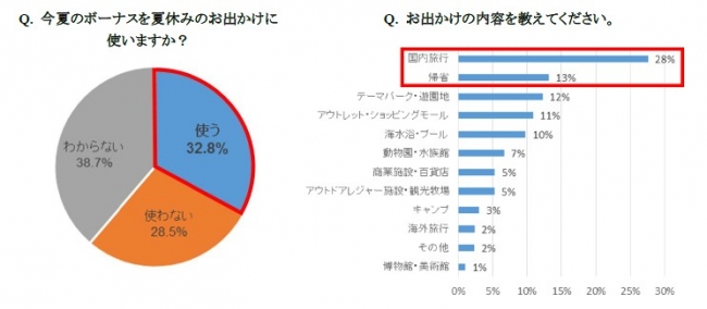 一方で夏休みのお出かけのためにボーナスを使うかどうか聞いたところ、主婦の約3割のみが「使う」と回答しました。また用途としては、「国内旅行」が28%と最も多く、次いで「帰省」(13%)と泊りでのお出かけに使う人が多いことがわかりました。