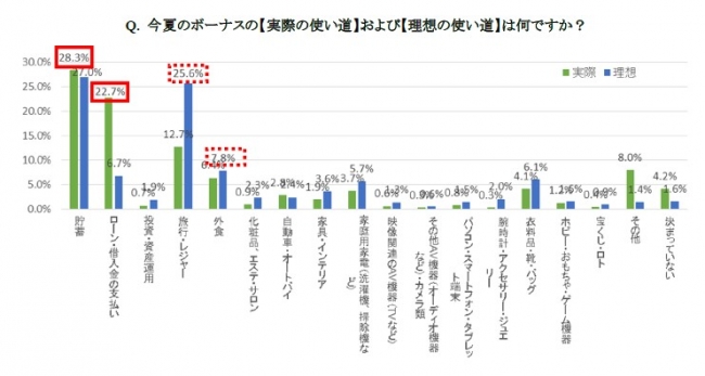 ▼ ボーナスの使い道は「貯蓄」「ローン返済」が上位で変わらず、本心は家族の絆を深める消費を希望