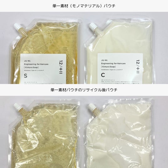 そこで、2019年より木村石鹸は株式会社G-Placeの助言のもとフジシールに協力し、パウチを単一素材化することで水平リサイクルを可能にするための共同研究を開始。