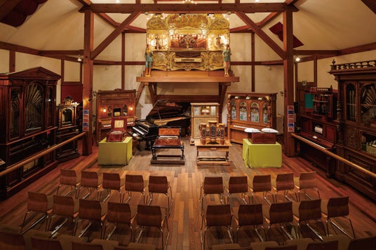 コンサート会場の萌木の村オルゴール博物館ホール・オブ・ホールズメインホール。200台以上のアンティークオルゴールなどを所蔵し、定期的に演奏会を開いている。