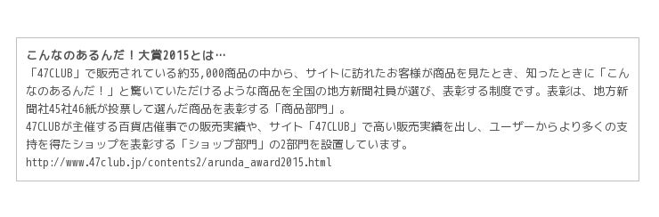 今年度、47CLUBが主催するアワード『こんなのあるんだ!大賞2015 ショップ部門 優秀賞』を受賞しました。