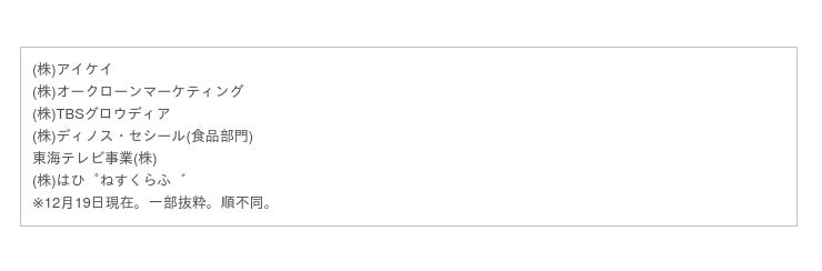 【参加バイヤー(予定)】(株)アイケイ、(株)オークローンマーケティング、(株)TBSグロウディア、(株)ディノス・セシール(食品部門)、東海テレビ事業(株)、(株)はぴねすくらぶ 他