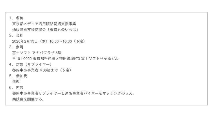 通販向け商材の大商談会「東京ものいちば」について、本年度の参加バイヤーが決定しました。開催にあたり、バイヤーとの商談を希望するサプライヤー企業を募集しています。(公式ウェブサイト:https://media.tokyo.jp/event/ )