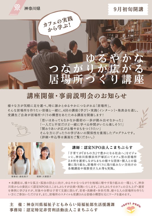 認定NPO法人こまちぷらす(神奈川県横浜市戸塚区)では、神奈川県福祉こどもみらい局福祉部生活援護課からの委託により、2025年9月より「カフェの実践から学ぶ!ゆるやかなつながりが広がる居場所づくり講座」を開催いたします。