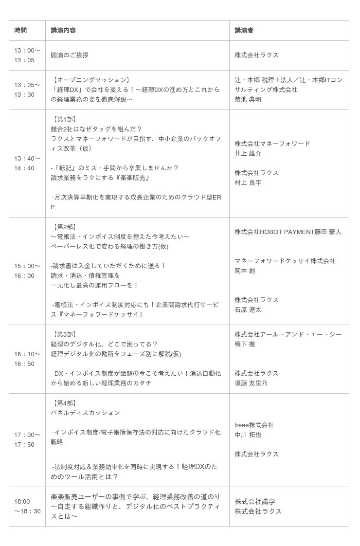 本イベントでは、経理サービスを提供する7社が集結し、今後の経理に求められる働き方や経理システムの可能性についてディスカッションする他、楽楽販売ユーザーである株式会社識学様をお招きし、業務効率化のカギとなる組織作りのポイントから現在のシステム活用方法までお話いただきます。