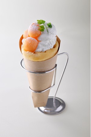 もちもち食感の焼きたてクレープになめらかなマンゴークリームと甘くジューシーな鉾田産メロンをトッピング。