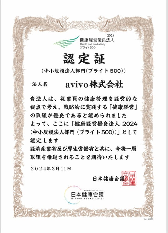 健康支援サービス・コンサルティング事業を展開するavivo株式会社(本社:愛知県名古屋市、代表取締役:降籏大祐、以下「avivo」)は2024年3月11日、経済産業省と日本健康会議が地域の健康課題に即した取り組みや日本健康会議が進める健康促進の取り組みをもとに特に優良な健康経営を実践している企業等の法人を顕彰する「健康経営優良法人2024(中小規模法人部門)」に8年連続で認定されました。