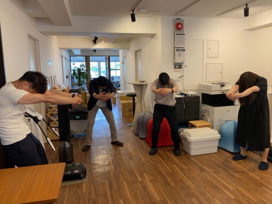 朝礼後に全員で自社製品のホームフィットネスツール「BODYBASE」や取扱商品などを使用し心と体のリフレッシュと社員とのコミュニケーションの時間を作り、こころとからだの健康促進を大切にしています。