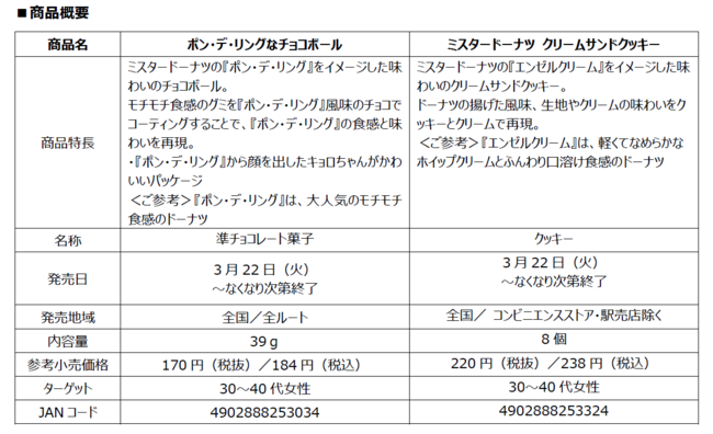 それぞれのドーナツの味わいや食感を、チョコボールや小枝、クッキーの美味しさと組み合わせることで、驚きと楽しさのある美味しい商品が実現できました。『ポン・デ・リング』をイメージしたモチモチ食感のチョコボール「ポン・デ・リングなチョコボール」、『エンゼルクリーム』をイメージした優しい味わいのクッキー「ミスタードーナツ クリームサンドクッキー」、『チョコファッション』をイメージしたサクサクした食感の小枝「小枝<チョコファッション>」、『ダブルチョコレート』をイメージした濃厚なチョコ感のマシマシ小枝「マシマシ小枝<ダブルチョコレート>」です。風味や食感の再現性、美味しさをドーナツと食べ比べても楽しめる商品です。森永製菓とダスキンの共同開発で、ドーナツをチョコボールや小枝、クッキーで表現するという夢のコラボレーションを実現することで、菓子市場を盛り上げてまいります。