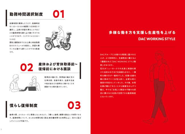 当グループの女性活躍推進の歴史、多様な働き方を支援し生産性を上げるDAC WORKING STYLE制度の紹介、人材育成について、などDACグループの核となる取り組みや、グループ各社での取り組み、28名の女性リーダー達の仕事への信念や哲学を紹介しています。