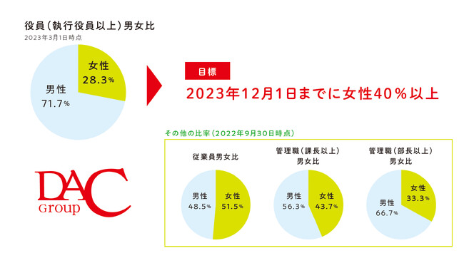 当グループは60周年を更なる成長の機会と捉え、より多様な視点、価値観を持った広告会社となるために、2023年12月1日までに役員(執行役員以上)の女性比率40%以上を目指しています。現時点でのグループ全体の同比率は28.3%となりますが、少しずつ進捗している状況です。