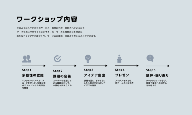 この度、業界をリードするデザイナー、エンジニアとソーシャルセクターのつながりから新たに、D&Iを推進する企業の支援を後押しするため、企画から事業化の支援までを体験できる、『デザインワークショップ』の提供を開始しました。