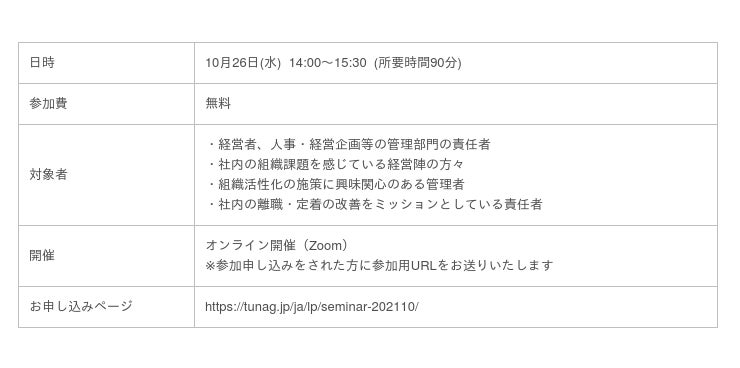 9月に開催したオンラインセッションでは、経営者・人事責任者の方々を対象に定員を超えるご応募をいただきました。また、当日参加できなかった方から2回目の開催を望む声を多くいただき、この度、再度開催する運びとなりました。この機会にぜひご参加ください。
