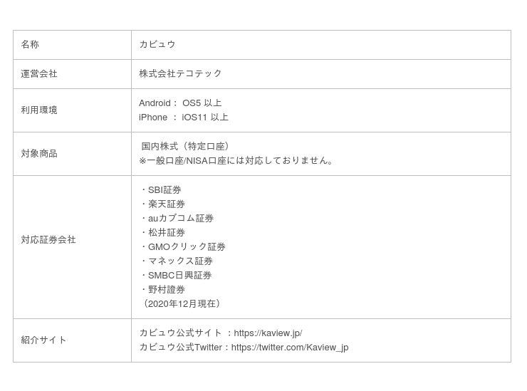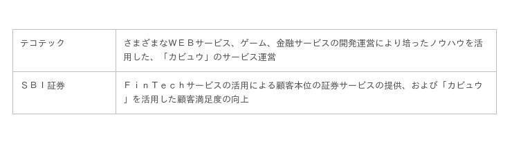 株式会社テコテック(本社:東京都港区、代表取締役社長:釣崎宏、以下「テコテック」)と株式会社SBI証券(本社:東京都港区、代表取締役社長:高村正人、以下「SBI証券」)は、テコテックが提供している、自動でトレード記録・分析アプリ『カビュウ』と「SBI証券 株」アプリとのコラボレーションを2020年12月4日(金)から開始いたします。