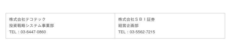 テコテックとSBI証券は、今後も個人投資家本位の投資サービス、環境作りについて検討を重ね、個人投資家の課題解決、証券市場の活性化に取り組んでまいります。