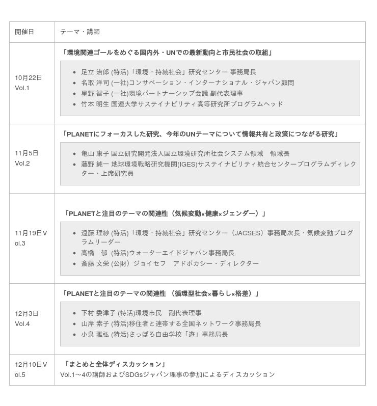 一般社団法人SDGs市民社会ネットワークは、今秋より「オンライン講座:SDGs市民カレッジ2021(全5回)」を開講します。本カレッジでは、気候危機への対応が待ったなしの状況の今、17の目標の基盤となっている、5つのP(People, Planet, Prosperity, Peace, Partnership)のひとつである“PLANET(地球環境)”に焦点を当てて、学びを深めます。課題どうしの関連性の理解力や包括的な思考力を養い、行動する人を輩出することをねらいとしています。