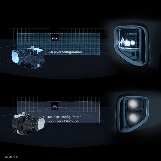 マレリのh-Digi(R) MicroLEDは、インテリジェント・ヘッドライト・システム向けの高解像度MicroLEDプロジェクション・モジュールで、25Kおよび40Kピクセル構成によりさまざまな車両セグメントに対応します。25K MicroLEDは、高精度ADBやアダプティブ・フロントライト機能、路面プロジェクション、ダイナミックな照明アニメーションに対応する成熟した、コンパクトかつ省エネルギーなソリューションです。40K MicroLEDは、オートチャイナで初公開され、プレミアム車両向けにピクセル密度と精度をさらに高めた製品として、展示と同時に見積もり受付も開始されます。