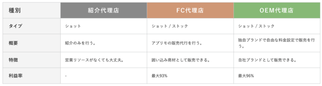 また、リニューアル前もご用意しておりましたapplimo(アプリモ)を販売・制作するFC代理店、自由なブランドで販売・制作が可能なOEM代理店も継続で展開いたします。