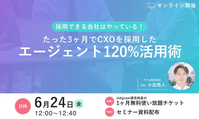 グラム株式会社(本社:東京都渋谷区、代表取締役:小出悠人)は、『採用できる会社はやっている!たった3ヶ月でCXOを採用したエージェント120%活用術』としてオンラインセミナーを開催いたします。