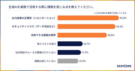 生成AIを業務で活用する際に感じる課題について尋ねたところ、「出力結果の正確性(ハルシネーション)」が45.8%で最多となりました(n=155/生成AIを業務で利用している方)。
