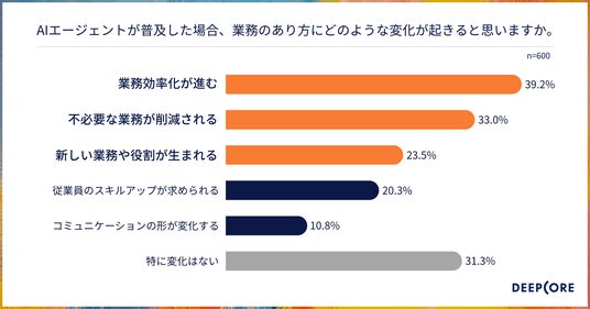 また、AIエージェントが普及すると、業務のあり方にどのような変化が起こると思うか尋ねたところ、「業務効率化が進む」が39.2%で最も多く、「不要な業務が削減される」が33.0%、「新しい業務や役割が生まれる」が23.5%と続きました(n=600)。
