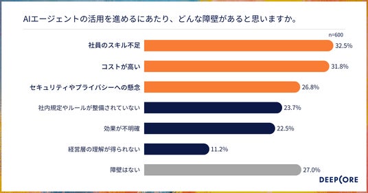 AIエージェントの活用を進める上での障壁について尋ねたところ、「社員のスキル不足」が32.5%で最も多く、「コストが高い」が31.8%、「セキュリティやプライバシーへの懸念」が26.8%と続き、導入に際しての技術的・コスト的な課題が浮き彫りになりました。(n=600)。