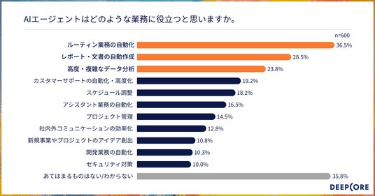 AIエージェントがどのような業務に役立つと思うか尋ねたところ、「ルーティン業務の自動化」が36.5%で最も多く、「レポート・文書の自動作成」が28.5%、「高度・複雑なデータ分析」が23.8%と続きました。一方、「新規事業やプロジェクトのアイデア創出」や「開発業務の自動化」といった創造的・専門的な業務は比較的低い割合にとどまりました。この結果から、現時点では定型業務やデータ処理の分野での活用が期待されていることがわかります(n=600)。