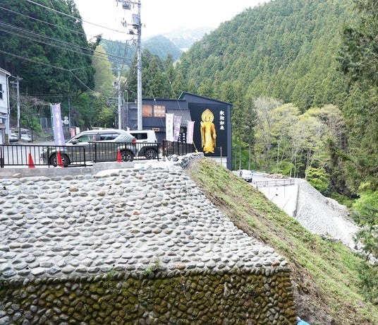 また、10年にわたり約38,000個の玉石を積み重ねた壮大な石垣が、ついに川沿いの法面に完成いたしました。