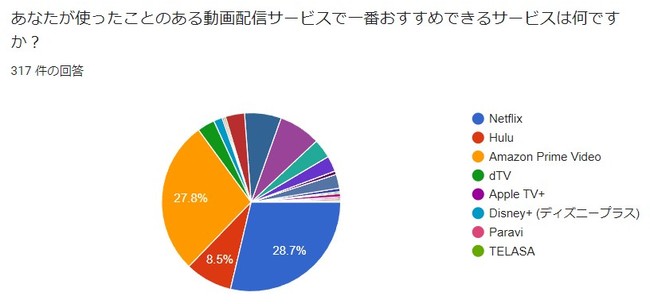 動画配信サービスを利用したことのある317名にアンケート調査を実施した結果、「Netflix(ネットフリックス)」が28.7%と一番おすすめできる動画配信サービスとなりました。