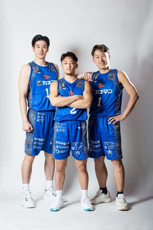 ヘラルボニー×岩手ビッグブルズ 復興特別ユニフォーム 左:仁平、中央:石川、右:後藤
