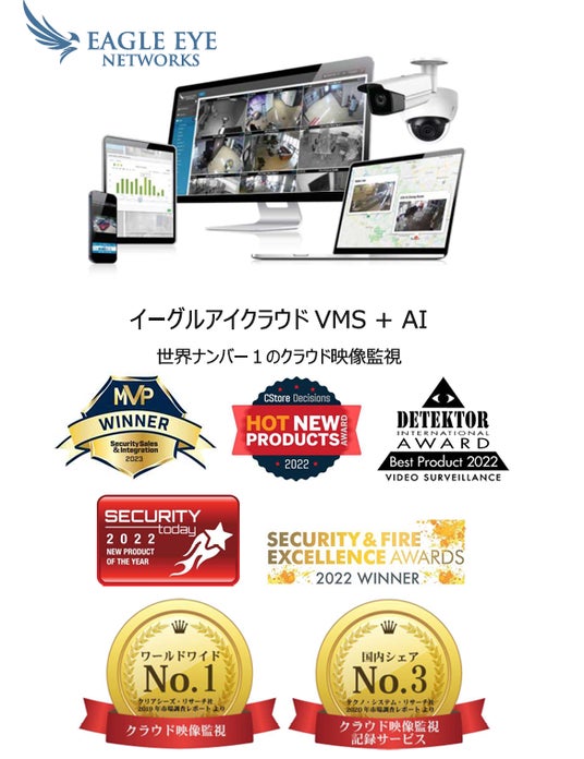 イーグルアイネットワークスはクラウド映像監視のグローバル リーダーとして、人工知能 (AI) と分析機能を備えたサイバーセキュアなクラウドベースの映像管理システムを提供し、あらゆる事業のセキュリティとビジネス運営の改善に貢献しています。クラウドとAI専用に構築されたシステムは、無限の拡張性、シンプルなサブスクリプション価格、高度な分析、最先端AI、柔軟性を実現するオープンRESTful APIプラットフォームにより、顧客のセキュリティとビジネス運営のニーズに対応します。イーグルアイネットワークスの製品とサービスは、リセラーとインテグレーターを通じて販売しています。2012 年に設立された イーグルアイネットワークスは、テキサス州オースティンに本社を置き、アムステルダム、バンガロール、東京にオフィスを構えています。詳細については、 https://www.een.com/ja/をご覧ください。