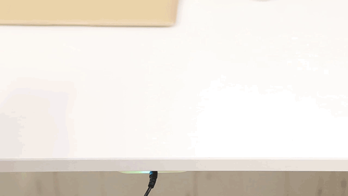 deskHackを机の下に貼り付け、コンセントを繋ぐだけでアッという間に机がワイヤレス充電器に。