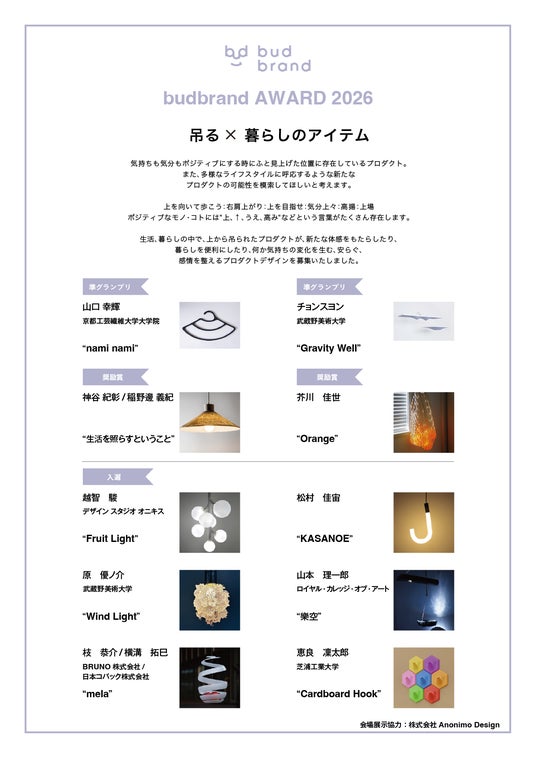 bud brand(バッドブランド)は、次世代クリエイターが世界へ向けて発信するプロジェクトとして、一般社団法人 日本 DESIGN BANKが2016年よりミラノデザインウィーク出展を支援、昨年10周年となった2025年の出展に続き、トルトーナ地区で今年も単独出展をいたします。budbrand AWARD 2026と題し、35歳以下の学生、デザイナーの方を対象にコンテストを開催しました。