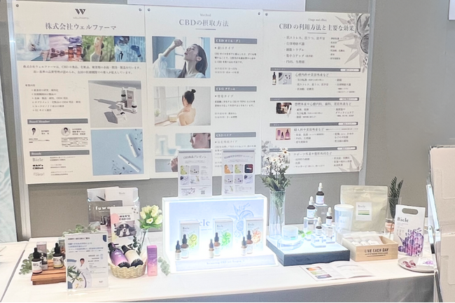 株式会社ウェルファーマのブースでは、医療機関専売CBDブランド『Bicle(ビクル)MED』をはじめ、一般販売のBicleブランド製品、ペット用CBDブランドM&N's(エムアンドエヌズ)、そしてデリケートゾーンケアブランドfuwari(ふわり)の製品を出展。