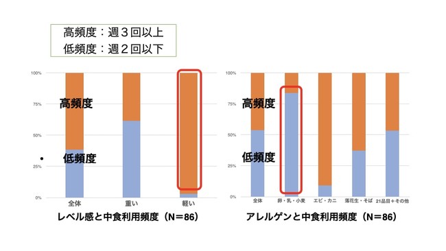アレルギーが軽いと感じている人は利用頻度が高く、重いと感じている人や卵・乳・小麦のアレルギーがある人は利用頻度が低い