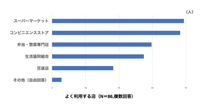 中食購入でよく利用する店を尋ねたところ、「スーパーマーケット」と「コンビニエンスストア」が上位となりました。