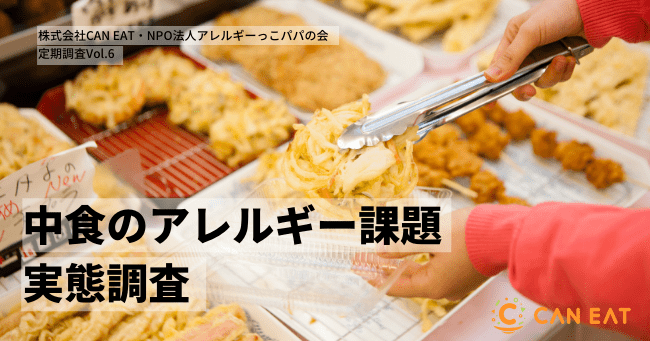 食べられないものがある人の外食を救うサービス「CAN EAT(キャンイート)」を開発・運営する株式会社CAN EAT(本社:東京都新宿区、代表取締役:田ヶ原絵里)は、NPO法人アレルギーっこパパの会と共同で、「食物アレルギー児家庭における中食に関する実態調査」を実施しました。2月17日~23日の「アレルギー週間」にあわせ、結果を公表いたします。弁当や惣菜等の中食を提供する飲食店の皆様をはじめ、多くの人々にアレルギー児家庭の現状について知っていただくきっかけとなれば幸いです。