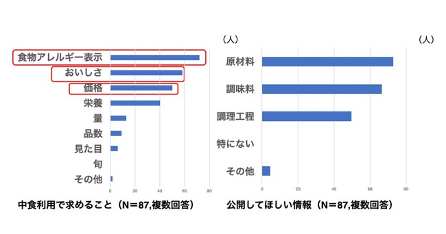 中食に求めることを尋ねたところ、「食物アレルギー表示」と回答した人がもっとも多く、次に「おいしさ」と「価格」が続きました。店に公開してほしい情報としては「原材料」「調味料」「調理工程」を挙げる人が多く、さらに原材料については「そのアレルゲンがどの具材に含まれているのかを具体的に知りたいので、弁当や定食では惣菜ごとにアレルギー表示をしてほしい」という声がありました。