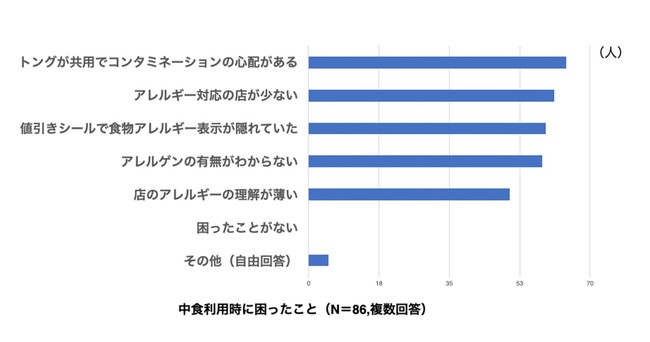 中食を利用した際に困ったことを尋ねたところ、「トングの共用でコンタミネーションの心配がある」がもっとも多くなり、次に「アレルギー対応の店が少ない」「値引シールで食物アレルギー表示が隠れていた」が続きました。その他に、商品の選択肢の少なさやアレルギー情報の確認方法について課題を感じている人がいました。