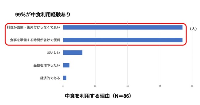 中食の利用経験を尋ねたところ、99%の人が「利用経験がある」と回答し、利用経験がある人にその理由を尋ねると、大半の人が「料理や後片付けをしなくていい」「食事を準備する時間が省ける」といった中食の利便性を挙げました。また、利用経験がない人にその理由を尋ねたところ、「アレルギーが重くて利用できない」という回答が得られました。