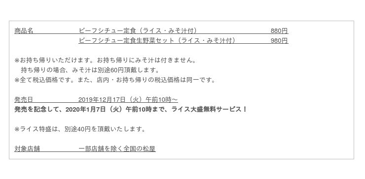 新発売を記念して、「ビーフシチュー定食」をご注文のお客様に限り、2020年1月7日(火)午前10時までライス大盛を無料サービスいたします。