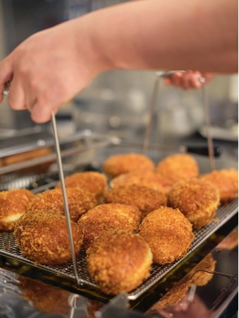 工場直送の生パン粉を使用しており、粗さなどはmm単位の調整をし、更にはテイクアウト=時間が経ってもサクサク感を残す為にパン粉に独自の粉をブレンドする事により、家に帰って食べてもサクサクした食感になるように仕上げております。