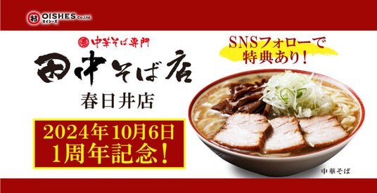 人気飲食店、つけ麺「つじ田」や江戸前天丼「金子半之助」などをグループで運営する、オイシーズ株式会社(所在地:東京都 千代田区 、代表取締役社長:工藤 智)傘下、株式会社 GMSが運営する「中華そば専門 田中そば店 春日井店」が 2024年10月6日 (日) に開業1周年を迎えます。皆様のご愛好に感謝し2024年10月1日(月)より1周年特別イベントを開催いたします。