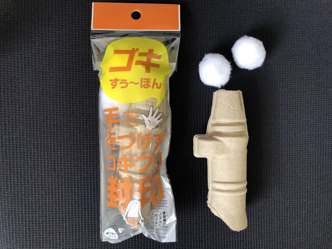 そのまま、付属の特性フワフワボールを2個吸い込む事で蓋となり害虫を【ゴキすぅ~ぽん】の中に閉じ込めます。最後に捕獲した害虫は、離れた状態からゴミ箱の縁に掃除機の柄を叩くと勝手に【ゴキすぅ~ぽん】が外れてゴミ箱に落ちる仕組みとなっています。なお、【ゴキすぅ~ぽん】は、燃えるゴミとして捨てることができます。